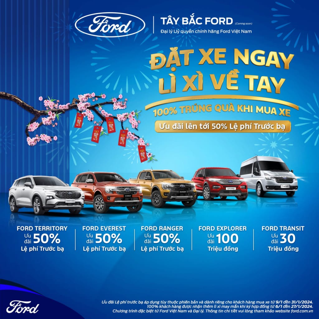 Tưng bừng chào đón năm mới 2024, Tây Bắc Ford trao lộc đầu xuân với Chương trình “Đặt xe ngay – Lì xì về tay”. 100% khách hàng ký hợp đồng và đặt cọc mua xe từ ngày 06/01 – 27/01/2024 sẽ có cơ hội “hái” lì xì may mắn với các phần quà giá trị: