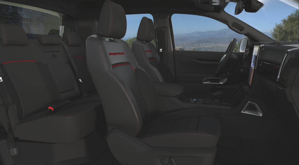 Nội thất Ranger Stormtrak mang thiết kế đặc trưng với tông màu đen kết hợp với đường chỉ đỏ tương phản, đặc biệt ghế da được thêu chữ “Stormtrak” màu đỏ cùng những công nghệ hiện đại trang bị trên xe giúp đáp ứng mọi nhu cầu của người lái.